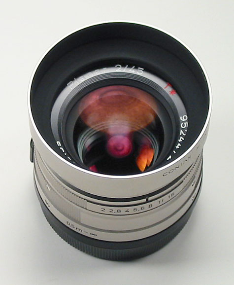 The lens I got along with the camera originally was the 35mm f/2 Planar G, which is a focal length that many consider to be slightly "wide". However, I'm more comfortable using short focal lengths and I consider 35-40mm to be "normal". This lens is very good, although there are those who claim it is the "weakest member of the G-series lenses". To me, it is a world-class performer with very sharp image quality, excellent color rendition, and very little distortion. What distortion it does have looks to be barrel distortion, in other words straight lines towards the edges of the frame tend to bend outwards from the center. This anomoly is slight, however, and does not tend to be noticeable in most situations. Construction wise, the 35mm Planar G is outstanding, being all metal and with a nice precision feel. It is also small and light, making for an ideal lens for traveling. I always use the metal lens hood and cap with this lens.
