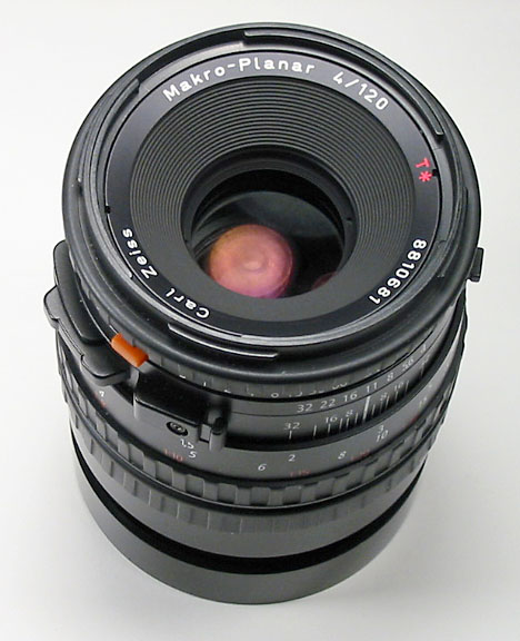 Although I would not consider the Zeiss 120mm CFi to be a true "macro" lens, it does indeed focus closer than the 150mm, and renders details in a sublime way when used at near distances. I also use a 55mm extension tube when I am working really close, but even still I opt for the OM 4 with 50mm f/3.5 macro lens and extension tubes for super-closeup work. This 120mm lens is also useable for portrait work, although to get the really "tight" headshots, I would reccommend the 180mm Zeiss instead. However, the combination of close focusing, superb image detail and lack of distortion make this lens a "must have" for those doing some portrait and some table-top macro work. I even find it to be remarkably detailed when focused at "normal" distances, and even out to infinity. This lens takes Bay 60 filters, however I use a Bay 60 to 67mm threaded filter adapter.